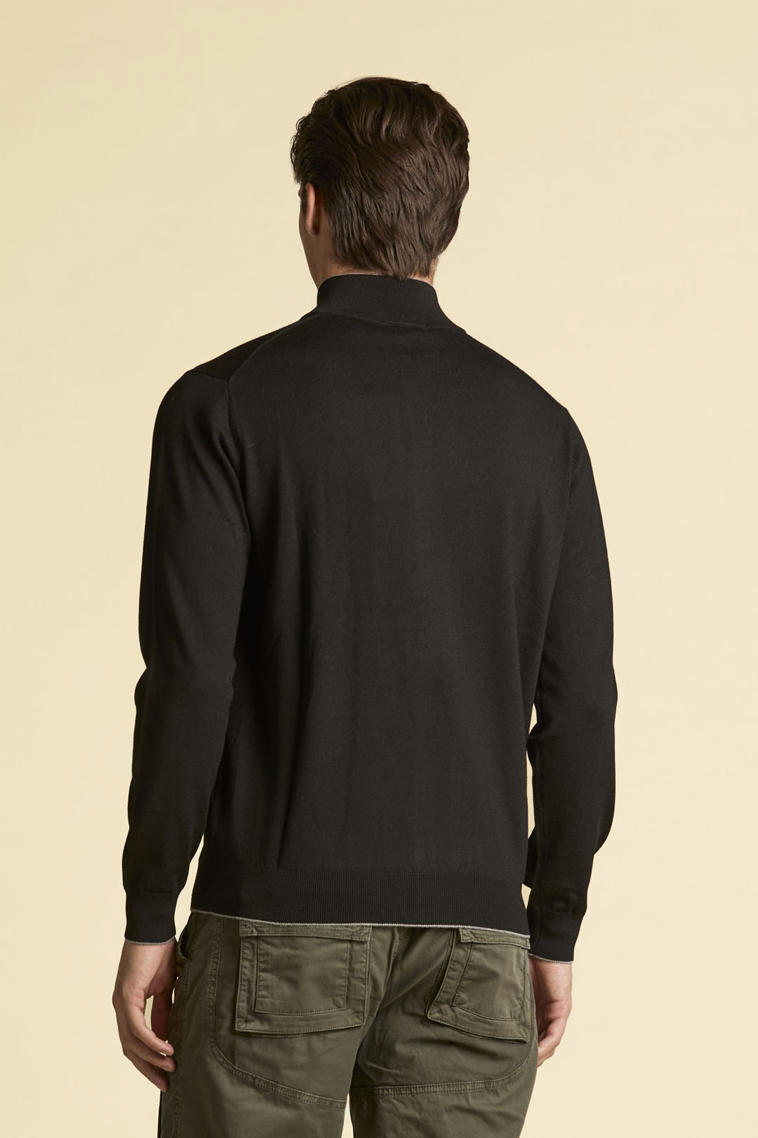 Dieser praktische, warme und raffinierte Pullover mit Reissverschluss ist aus reiner, Merinowolle gefertigt, die für ihren weichen Griff und ihre Fähigkeit, leichte, natürliche Wärme zu spenden, geschätzt wird. Er ist ideal als zusätzliche Schicht in den kühleren Monaten und zeichnet sich durch seinen hohen Kragen, den zentralen Reissverschluss und ein einziges, dezentes Stildetail aus: das gestickte Logo auf der linken Brust.