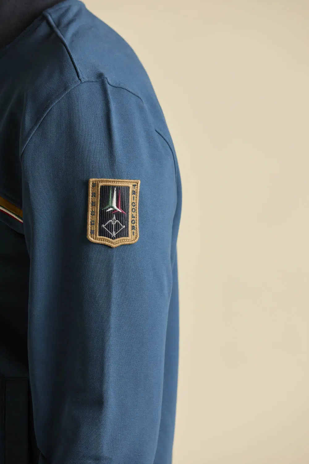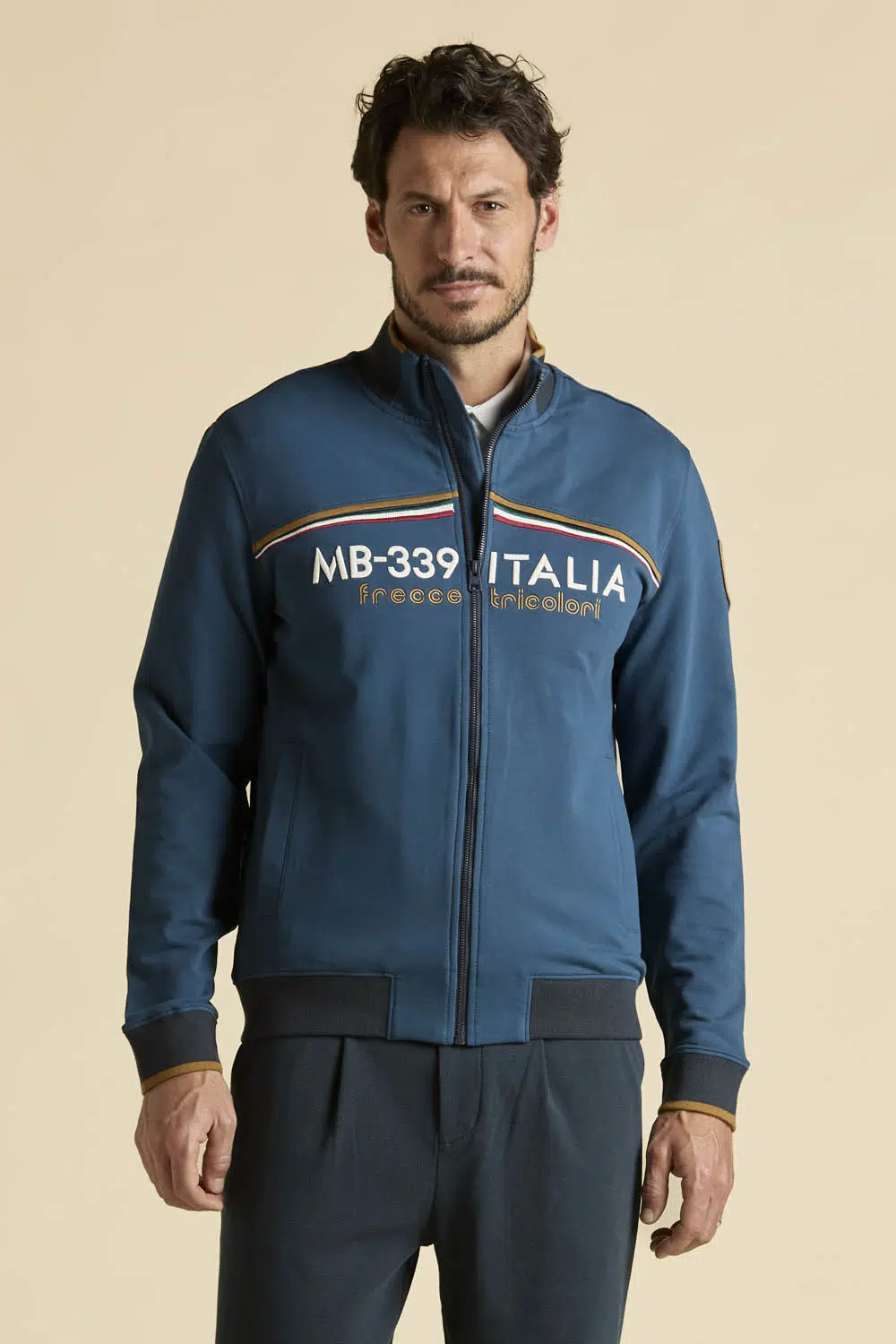 Dieses Herren-Sweatshirt feiert die italienische Luftfahrt mit einem Design, das sportlichen Geist und Identität vereint. Gefertigt aus weicher Stretch-Baumwolle, zeichnet es sich durch die vordere Stickerei „MB-339 ITALIA Frecce Tricolore“ aus, eine Hommage an das berühmte Flugzeug der Nationalen Kunstflugstaffel. Das Trikolore-Profil entlang der Brust und die kontrastierenden Rippbündchen unterstreichen den markanten Charakter, während der Frontreissverschluss und der hohe Kragen einen Hauch technischer und funktionaler hinzufügen. Ein ikonisches Kleidungsstück, gedacht für alle, die jeden Tag mit derselben Leidenschaft und Präzision wie im Flug leben.