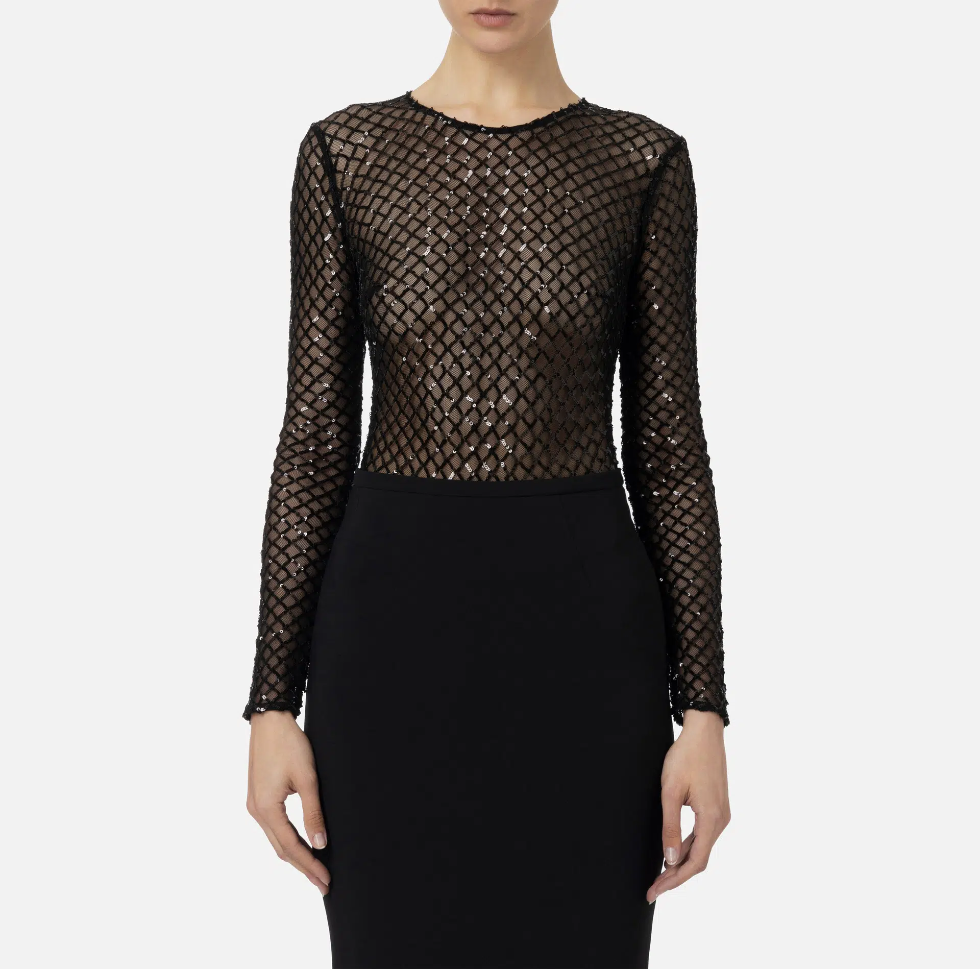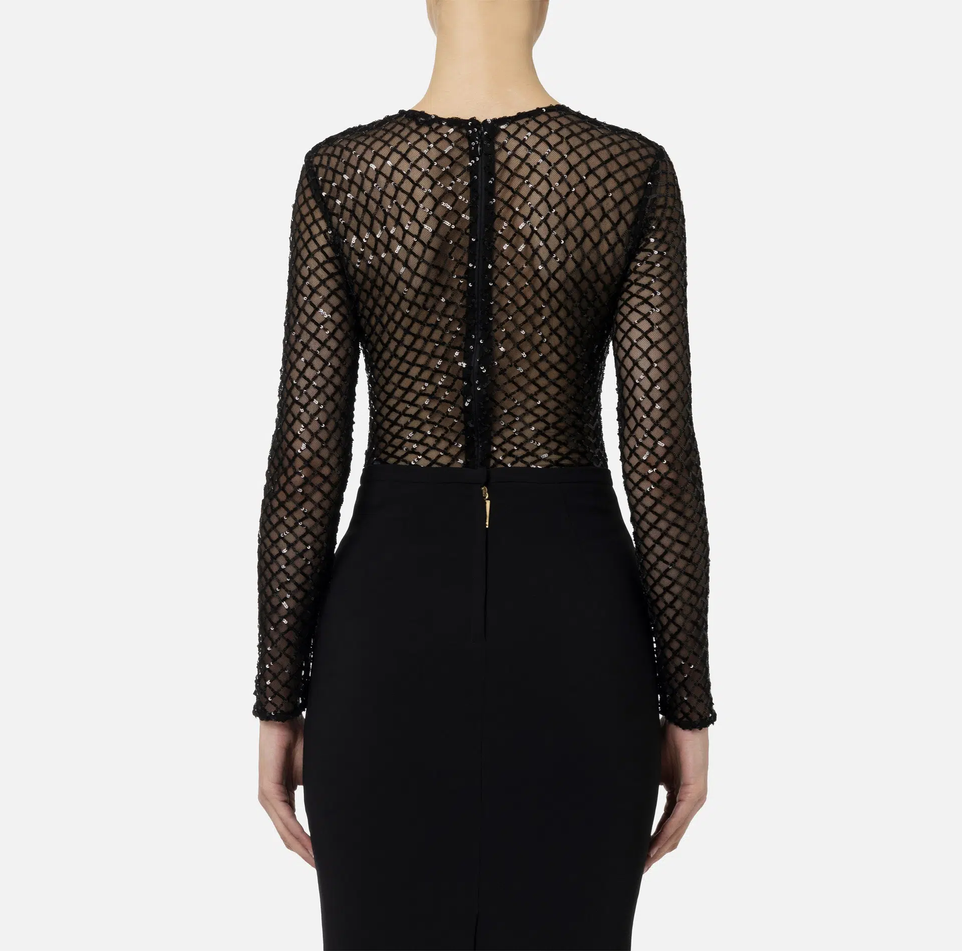 Body aus mit Pailletten im Chevron-Motiv besticktem Tüll und mit langen Ärmeln.