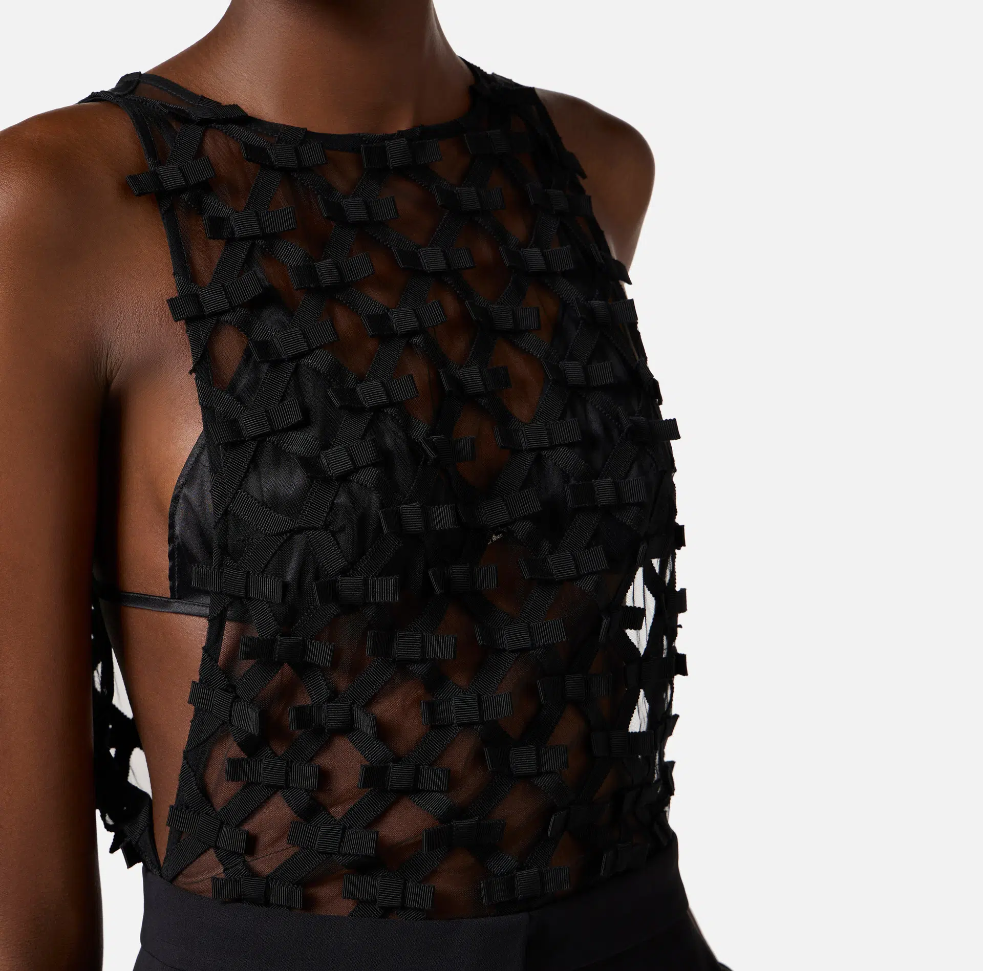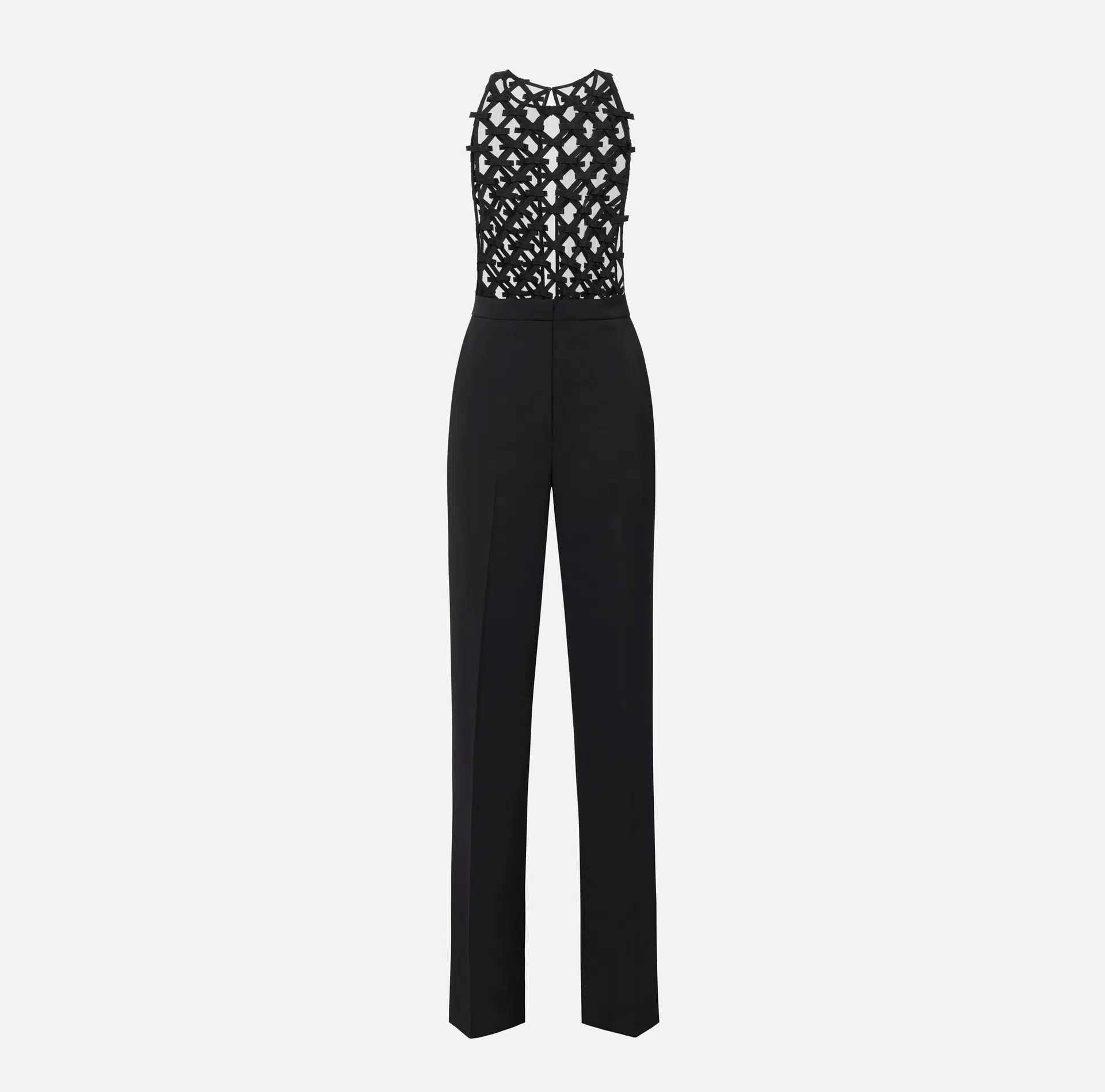 Jumpsuit aus leichtem-Crêpe. Das Modell besticht mit einem raffinierten Rautenmotiv, das den Oberkörper verziert, und mit gestickten Schleifen, die ihm einen dreidimensionalen Charakter verleihen. Regular-Passform.