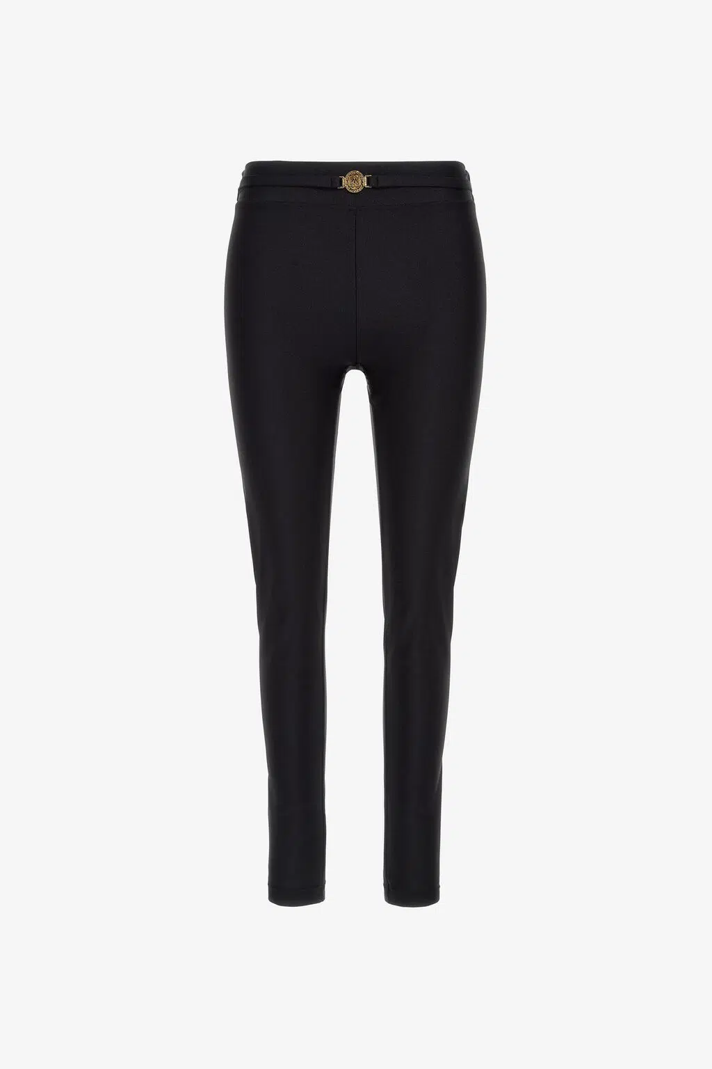 Enge Leggings, die sich wie Strümpfe anfühlen, mit einem Fake-Gürtel an der Taille, der mit einer goldenen Tigerkopf-Medaille verziert ist.